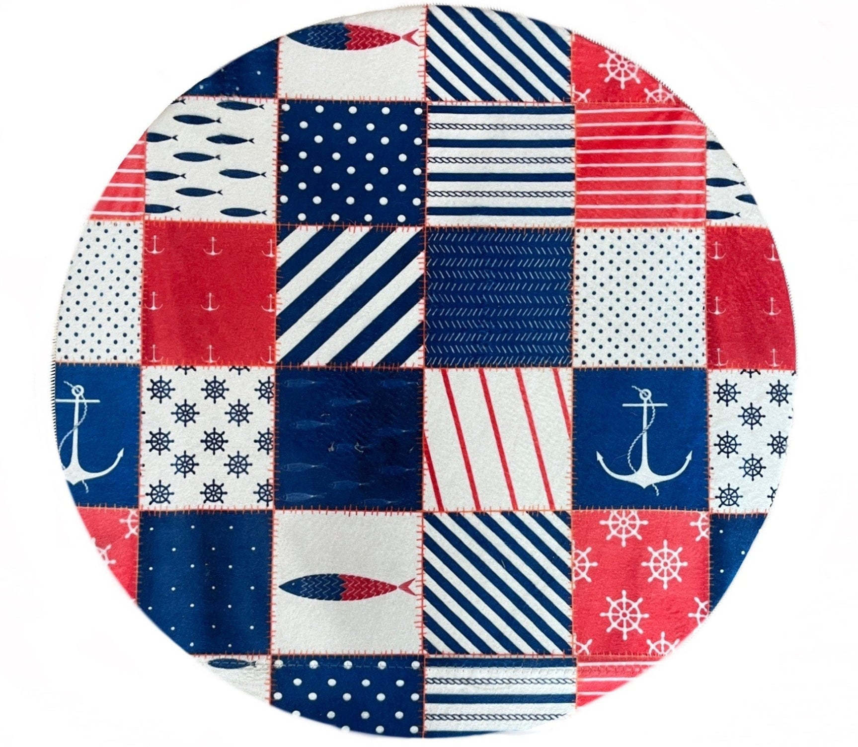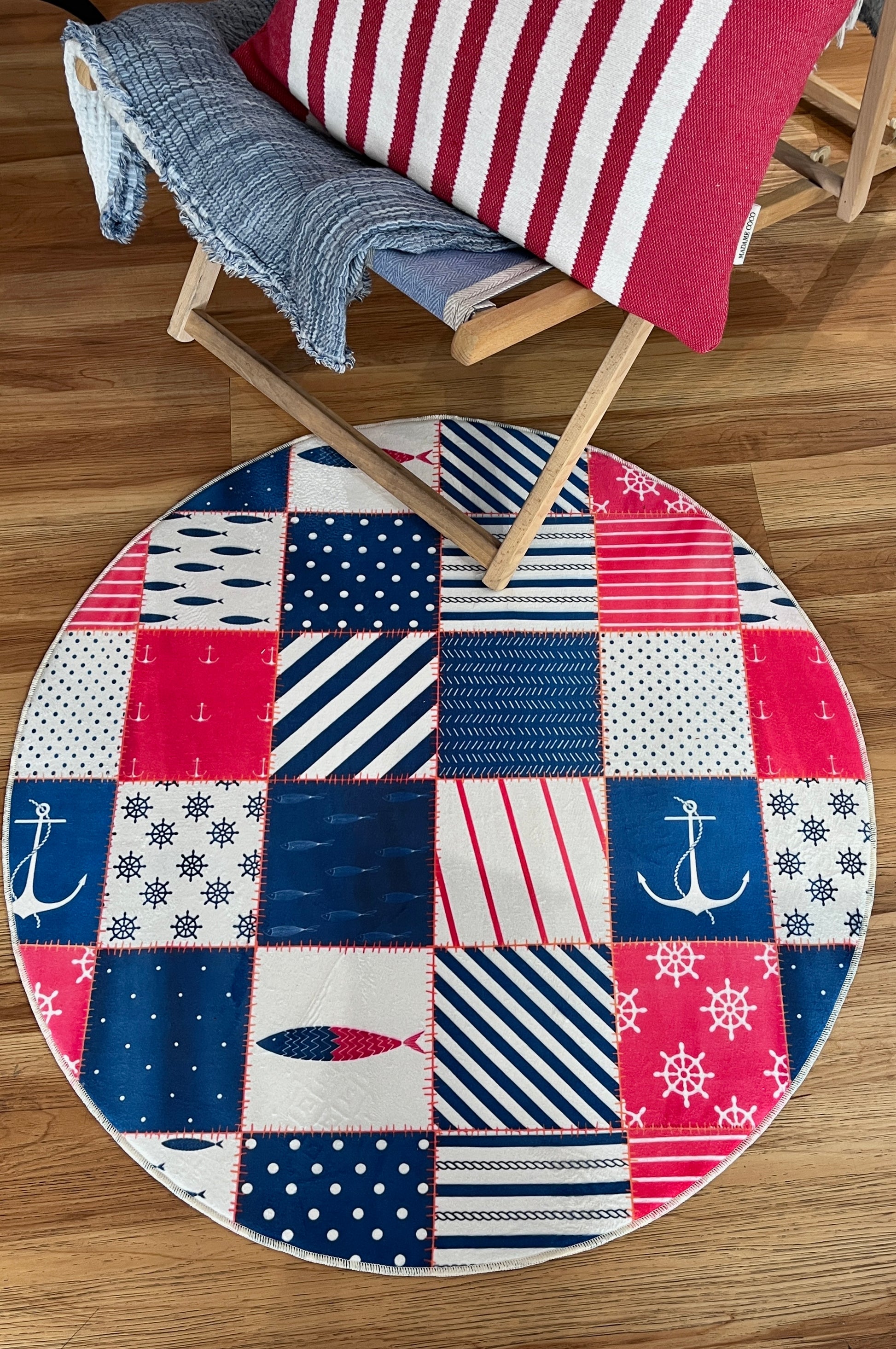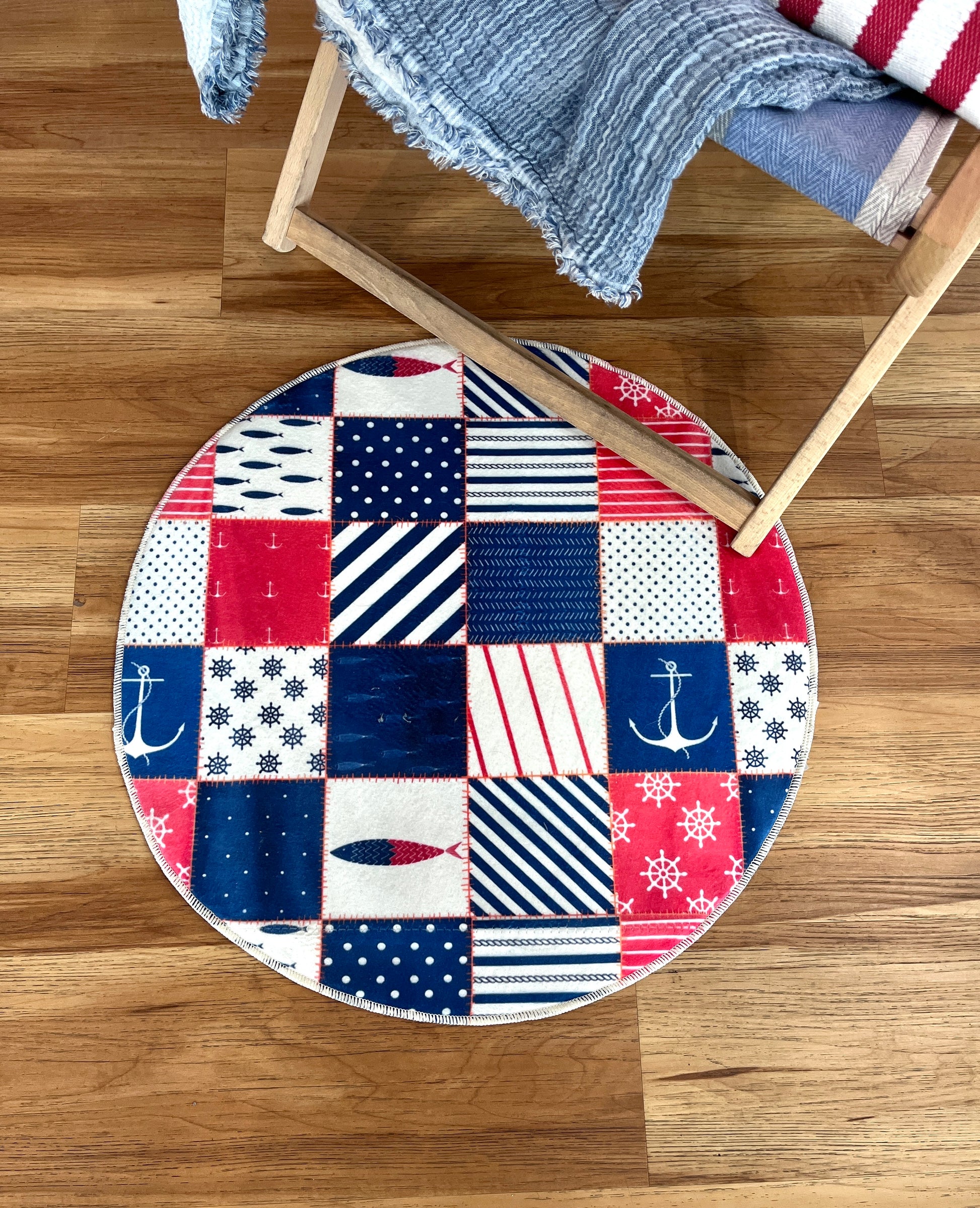 Auf dem Teppich sind verschiedene Patches zu sehen in klassischen nautischen Farben wie rot, weiß und blau . Die Muster variieren und umfassen verspielte Punkte, elegante Streifen, charmante Anker, Steuerräder, Fische , die alle zusammen ein harmonisches Gesamtbild ergeben. Die liebevolle Gestaltung und die detailreichen Motive schaffen eine frische und einladende Atmosphäre.